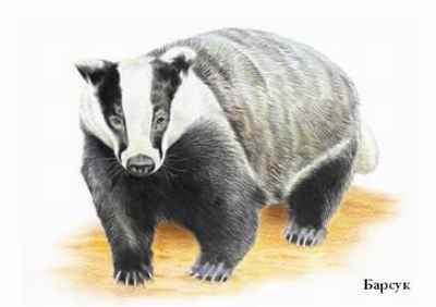 БАРСУ́К, млекопитающее сем. куньих. Единственный вид рода. Туловище приземистое, лапы короткие, голова клиновидная. Дл. тела 60—90 см, масса летом 7—13 кг, осенью до 24 кг. Окрас сверху серебристо-серый, снизу чёрный. На голове чёрные и белые полосы. Под хвостом специфическая железа, секрет которой обладает резким запахом. Обитают барсуки в Евразии. Населяют смешанные леса с оврагами. Живут кланами. Строят разветвлённые сложные норы, которые используют десятилетиями. Коммуникация (общение) при помощи зрительных, обонятельных и слуховых сигналов. Всеядны (питаются корневищами, ягодами, орехами, грибами, мелкими позвоночными и беспозвоночными). Впадают в зимний сон, который длится с октября по март—апрель. В помёте 1– 6 щенков. Мех барсука не имеет большой ценности, волос используют для производства кистей, сало обладает целебными свойствами.