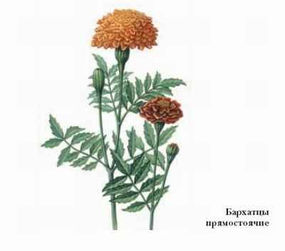 БА́РХАТЦЫ(тагетес), род однолетних и многолетних травянистых растений сем. сложноцветных. Включает ок. 35 видов, дико произрастающих в субтропиках Америки. В цветоводстве широко используют 3 однолетника. Бархатцы прямостоячие – куст выс. 30—100 см. Соцветия – корзинки диам. до 15 см, цветки простые или махровые, окраска жёлтая, лимонная, оранжевая, коричневая с разными оттенками. Зацветают в конце июля – начале августа. Бархатцы отклонённые – куст выс. 15—50 см. Соцветия диам. 4—6 см, цветки простые или махровые, окраска жёлтая, оранжевая, красно-коричневая с большим количеством оттенков. Язычковые цветки бывают двухцветные. Зацветают в начале июля. Бархатцы тонколистные, или рассечённые, – куст выс. 20—30 см. Соцветия диам. 2—3 см, состоят из одного ряда широких жёлтых язычковых и жёлтых или оранжевых трубчатых цветков. Зацветают в сер. июля. Все бархатцы обладают характерным запахом, теплолюбивы, светолюбивы, засухоустойчивы. Цветут до поздней осени. Выведено много сортов с различной окраской.