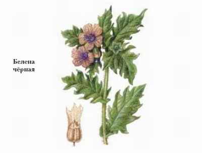 БЕЛЕНА́, род растений сем. паслёновых. Включает ок. 20 видов однолетних и двулетних трав, распространённых в Евразии и Северной Африке. В России 2 вида, встречающиеся в европейской части и в Сибири. Растут по сорным местам и обочинам дорог. Белена чёрная – двулетник, образующий в первый год розетку продолговато-яйцевидных листьев с неприятным запахом, а на второй год – облиственный стебель выс. до 1 м, несущий крупные, неправильные, колокольчатые, грязно-жёлтые цветки. Плод – коробочка. Лекарственное растение, обладает болеутоляющим и спазмолитическим действием. Ядовито.