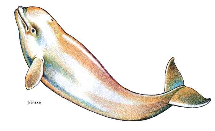БЕЛУ́ХА, морское млекопитающее сем. дельфиновых. Дл. тела до 6 м, масса до 2 т. Окрас светло-серый, почти белый (отсюда название). По мнению учёных, светлая окраска помогает сохранить тепло, уменьшая теплоотдачу, что очень важно, т.к. обитают белухи в холодных водах среди льдов (распространены во всех морях Арктики и в прилегающих бассейнах). Отсутствие спинного плавника объясняется тем, что спиной белухи разбивают тонкий лед. Летом предпочитают держаться близ берегов или в открытом море, зимой – в незамерзающих полыньях. Питаются в основном рыбой, реже головоногими моллюсками. Плавают медленно (1,5—2 км/ч), но могут развивать скорость до 22 км/ч. У них очень хороший слух, разнообразна гамма издаваемых звуков, прекрасно развита эхолокация. Ведут стадный образ жизни, летом собираются до тысячи и более голов. Половозрелость наступает в 6—9 лет. Беременность длится 11—12 мес. Самка ежегодно приносит одного детёныша. Продолжительность жизни ок. 30 лет. Белухи хорошо переносят неволю, быстро привыкают к человеку и в океанариумах легко обучаются различным трюкам. В России промысел не ведётся.
