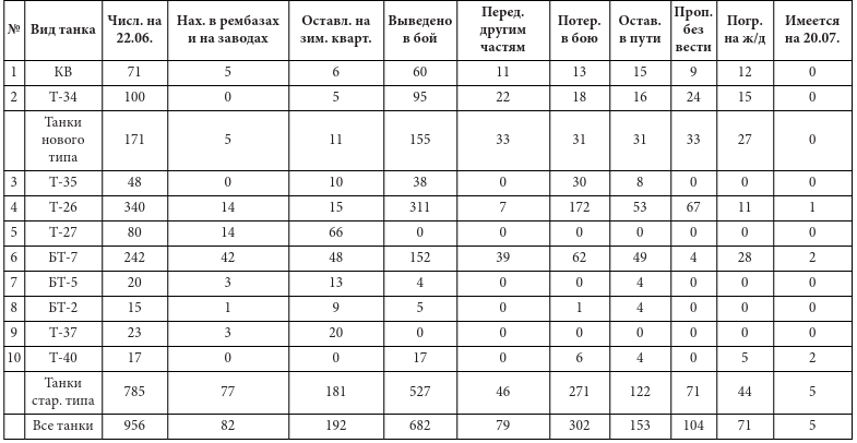В качестве комментария к первой из таблиц надо прежде всего отметить, что в ней не сходится баланс наличия и потерь по танку БТ-7. Но, как говорится, за что купил, за то и продаю. Автор вынужден оперировать теми цифрами, которые приведены в работе А. Исаева, и почему в них есть расхождения, можно только догадываться. В любом случае эти расхождения являются не столь уж и существенными и на общую картину наличия и потерь танков рассматриваемого мехкорпуса почти не влияют.