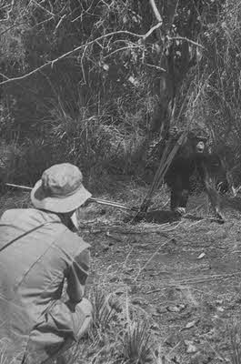 Синклер подтаскивает обезьяну к опушке леса, и там Роберт прекращает свой «танец», потому что ему негде развернуться. Мы продвигаемся дальше по лесу, чтобы обойти стороной «обезьянью» лужайку. Однако Роберт и не думает возвращаться к своим самкам: оп твердо решил идти с нами. Шерсть на нем по-прежнему стоит дыбом.