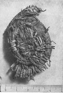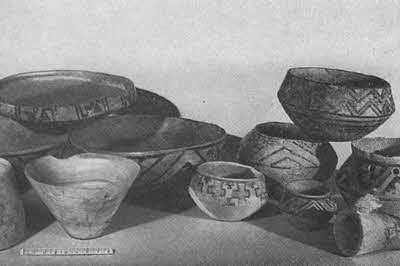 В одном из могильников Геоксюра-1 была найдена корзина из тростника, вернее, ее дно. В таких корзинах жители оазиса хранили зерно Образцы посуды геоксюрцев. Ее изготовляли обычно из глины, изредка из мраморовидного известняка (два сосуда слева на переднем плане)