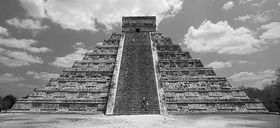 А вот как выглядел мексиканский зиккурат, воздвигнутый цивилизацией майя… 30-метровая, квадратная в основании пирамида, по каждой стороне которой вверх тянутся лестницы. Наверху – храм Кукулькан.