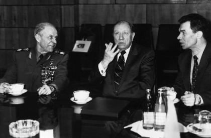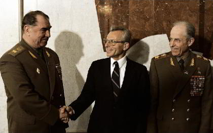 Министр обороны СССР Дмитрий Язов (слева) и начальник Генерального штаба ВС СССР Сергей Ахромеев (справа) встречаются с министром обороны США Фрэнком Карлуччи (в центре) // РИА Новости / Владимир Родионов