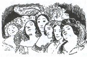 Девушки играют и поют, смотря по тому, к какому отростку принадлежала их гостиная. В одной разыгрывают вариации Моцарта и Россини, в другой повторяют мотивы из опер: «Роберта», «Цампы», «Фенеллы», «Капулетти и Монтекки» и т.д., в иных гостиных музыка ограничивается наигрыванием разного рода вальсов и качучи, или весьма невинно поется: «Ах, подруженьки, как грустно, целый век жить взаперти», кончаемое обыкновенно: «Уж как веет ветерок»; а в иных дошли еще только до романсов: «Талисмана», «Голосистого соловья» и удалой «Тройки».