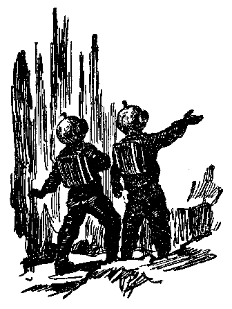 – Это не водолазные костюмы. Это костюмы, в которых можно было бы гулять в межзвёздных пространствах, где царит абсолютный холод в двести семьдесят три градуса. Костюмы сделаны из материала совершенно нетеплопроводного, и при них резервуары с кислородом.