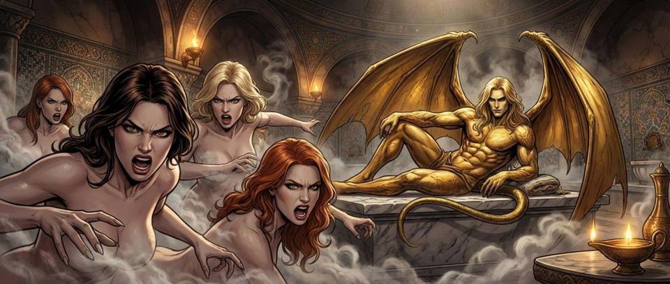 Ракарномал вступил в залу хаммама. Ароматный пар скрывал очертания, но гохеррим сразу заметил блеск золотой кожи. На массажном столе возлежал крылатый атлет, которого разминали сразу двенадцать рук. Шесть самоталер с каким-то животным обожанием наглаживали своего повелителя, и тот издавал томное урчание, как обленившийся и разожравшийся кот.