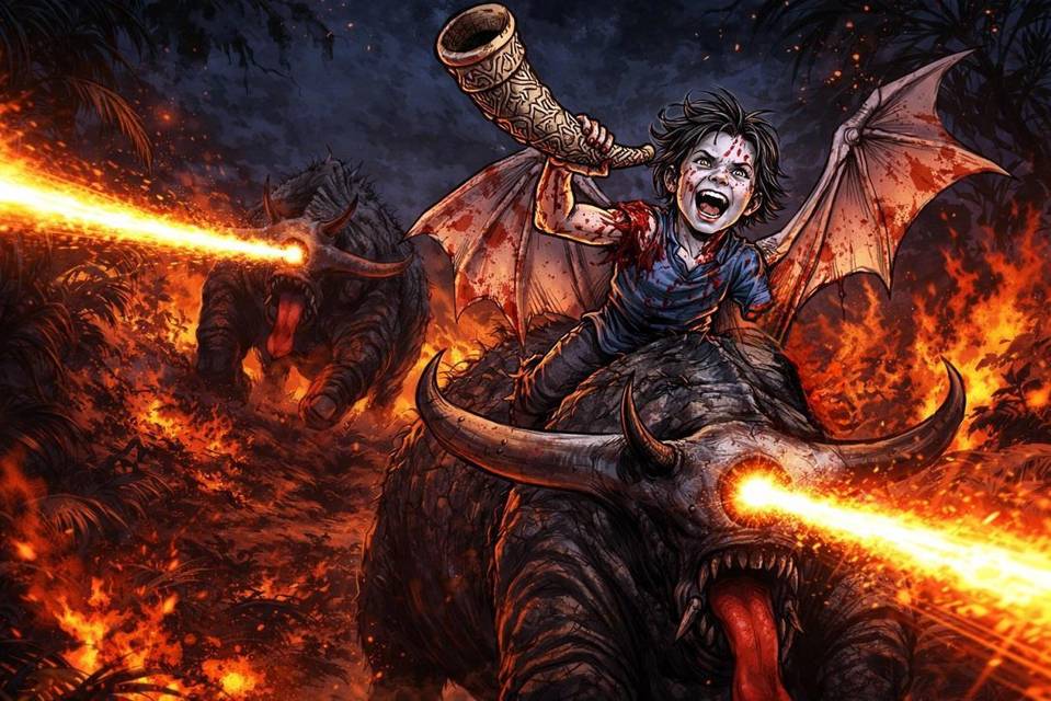 А тут еще и затрещали деревья, загрохотала земля, и в деревню с ревом и топотом ворвалось целое стадо антарнохов! На переднем сидел окровавленный, изрубленный мальчишка, единственной рукой держащий покрытый резьбой рог. Он ожесточенно дул в него, и антарнохи со всей округи бежали на этот зов, испепеляя тех, на кого их вожак указывал.