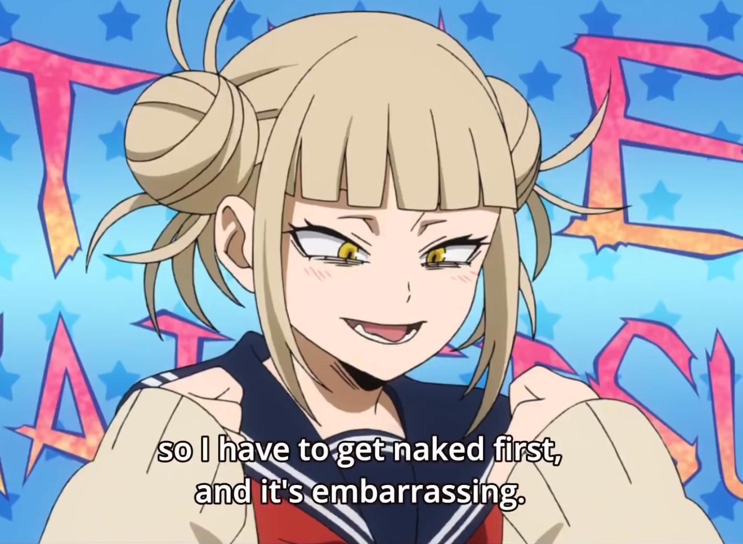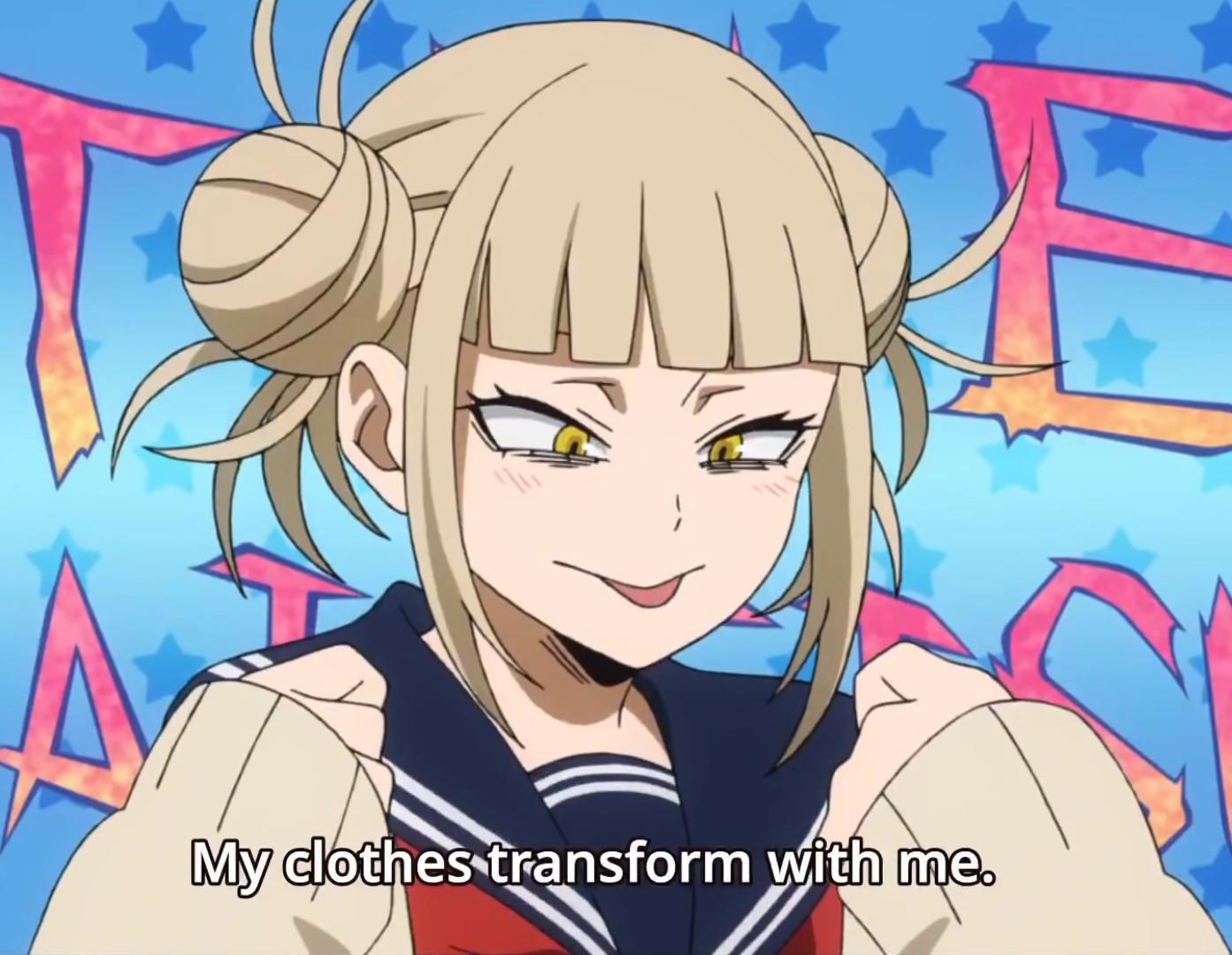 Наконец, момент из канона, который лег в основу событий этой главы: Тога поясняет за свою причуду и подтверждает, что она превращает ее одежду вместе с ней, оставляя ее после обратной трансформации.