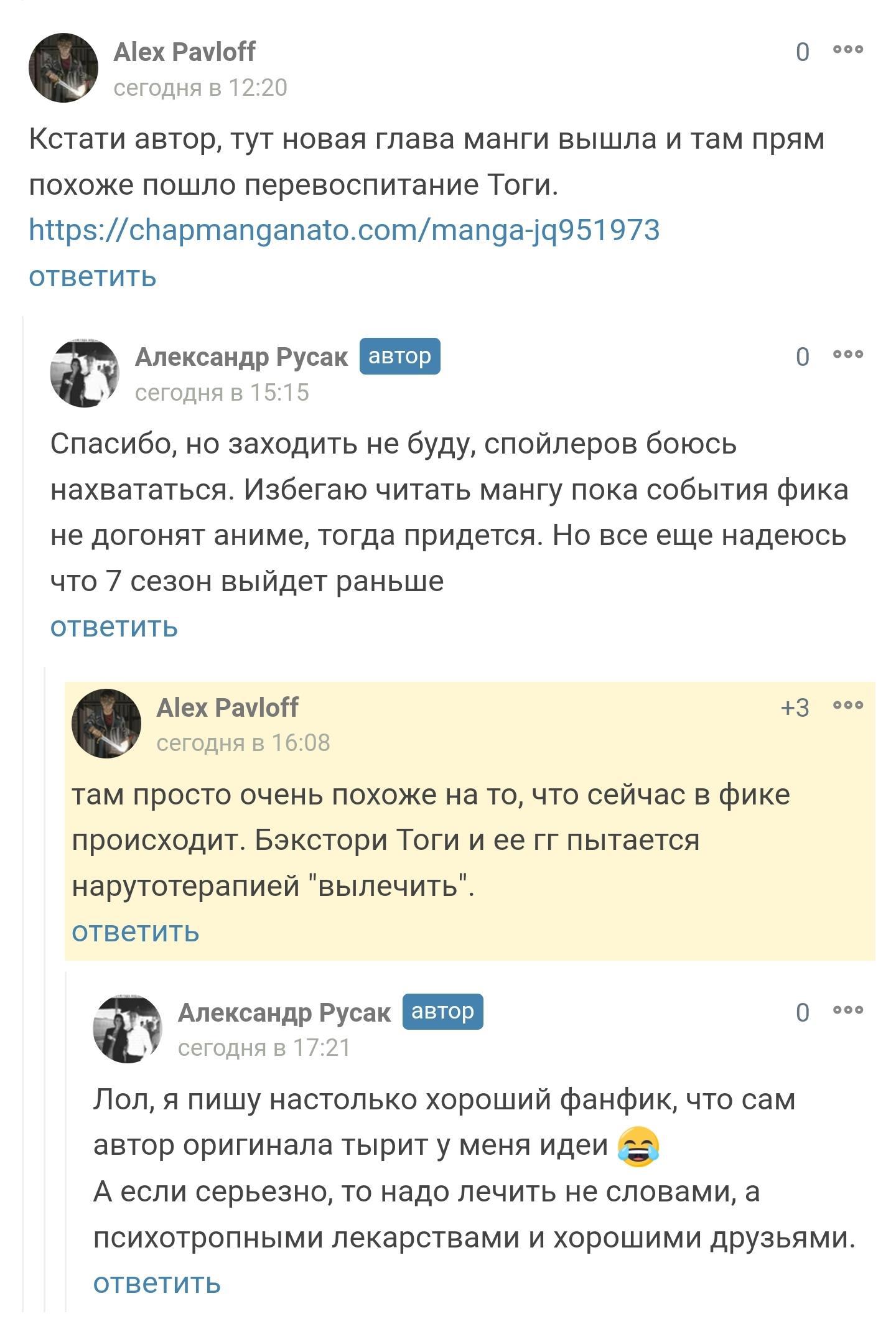 Сегодня, 22 июня 2023 года, я узнал от подписчика, что автор манги в ее финальных главах начал Тогу, вроде как, перевоспитывать. Хочу отметить, что фанфик на этот момент уже почти год писался, а Химико в публичном доступе в нем перевоспитывается уже месяц.