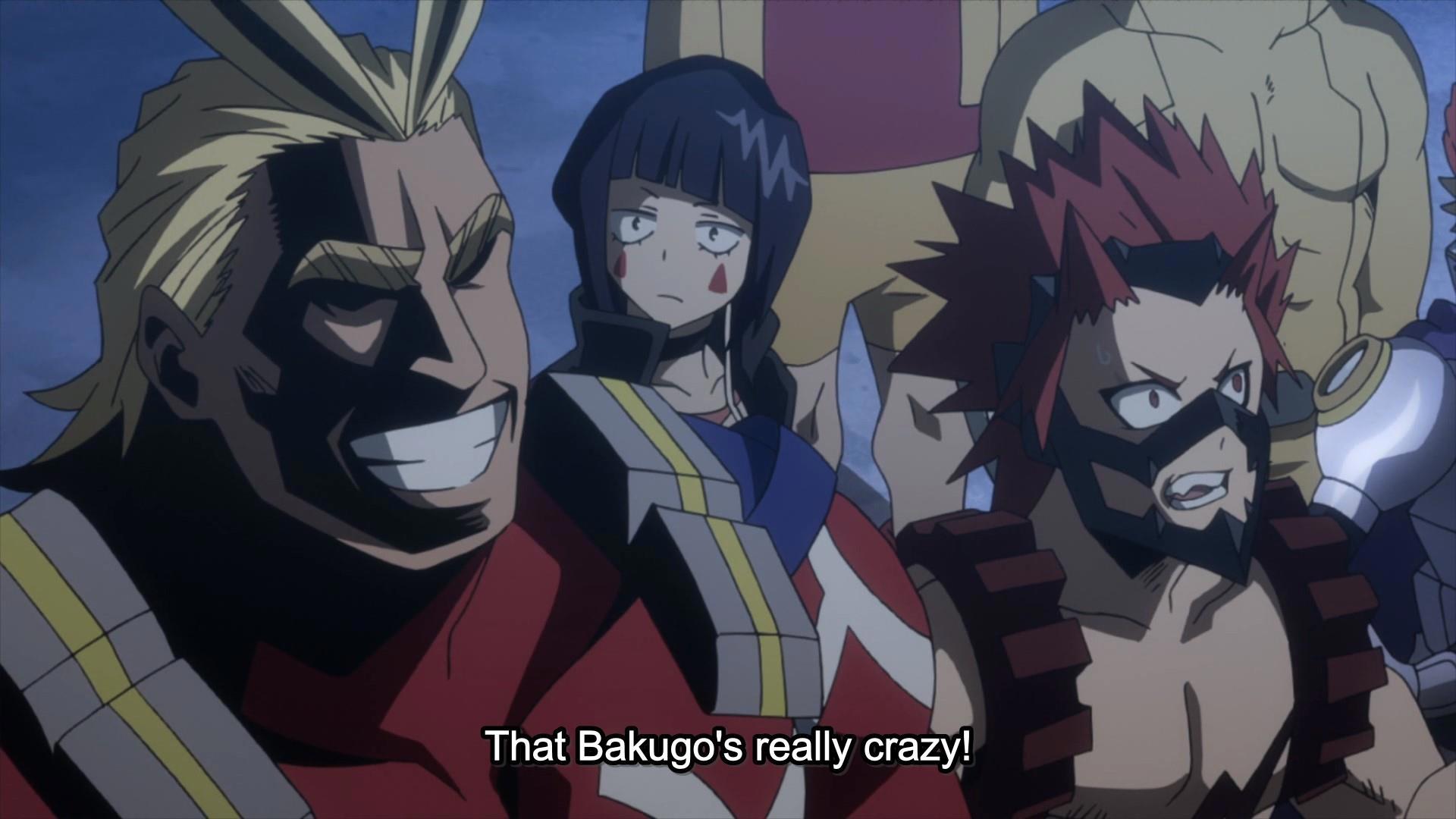 Когда две девушки и… я даже не знаю, какое слово подобрать, чтобы описать его состояние. Отчаявшийся? Уничтоженный? Потерянный? Короче говоря, когда девушки и психологически травмированный Бакуго вернулись в зал, Всемогущий анонсировал третью битву.