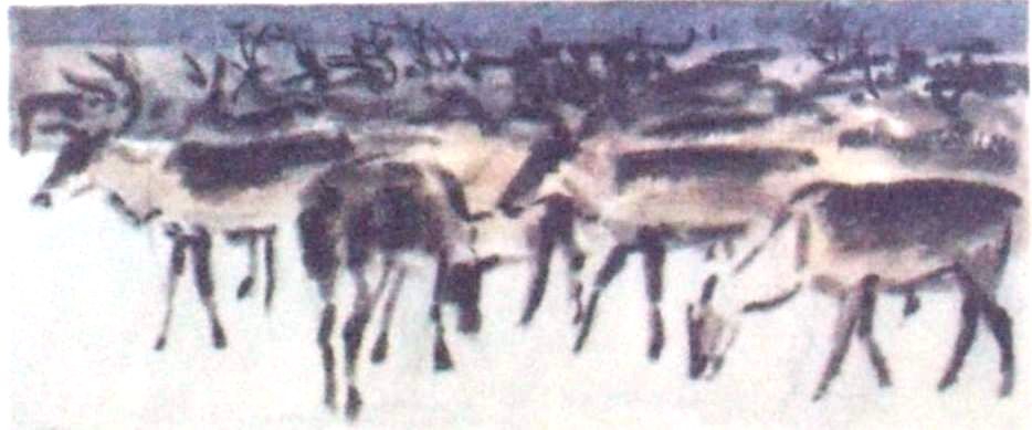 Раз в году заходит и сюда беспокойный человек, нарушая угрюмое безлюдье дикого побережья. Каждый раз как ударит лютый мороз и проложит крепкие дороги через топи и тундры, а на море в мглистой дали обрисуются беспорядочные очертания полярных льдов, грозно надвигающихся с океана, – с далеких берегов Мезени и из прибрежных селений, через тундры и перелески старого леса, скрипя железными полозьями по насквозь промерзшему снегу, тянутся оригинальные обозы: низкие ветвисторогие северные олени, запряженные в длинные черные лодки на полозьях, гуськом идут друг за другом, осторожно ступая по крепкому насту, а рядом тяжелой, увалистой походкой широко шагают косматые белые фигуры.