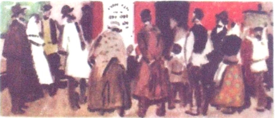Море голов, море человеческих голосов, восклицаний, смеха, брани, и среди этого волнующегося репинского моря от века тот же, неизменный, непобедимый, непреклонный, все тот же... балаган. «Века проходили, все к счастью стремилось, все в мире по нескольку раз изменилось», один только нерушимый, как серый гранит среди пенящегося народного моря, высится балаган.