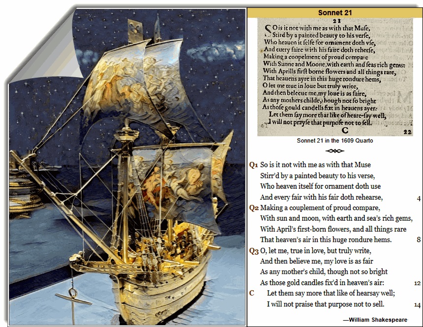 Однако, строка 4 сонета 21, отражая иронию, присущую шекспировской строке звучит каламбурно, с одной стороны. Так как поэтическая строка, как бы она не была прекрасна не в состоянии вместить в себя все красоты ночного звёздного неба над морем во время штиля при полной луне. С другой стороны, следующие строки 5-6, поясняющие строку 4 отчасти компенсируют каламбур четвертой строки.