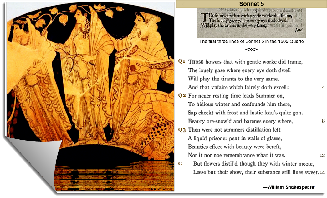 Характерно, но при рассмотрении поэтических образов сонета среди критиков возникли споры из-за их не неверных интерпретаций, как к примеру, в первой строке сонета 5 Уильяма Шекспира, это поэтический образ «hovers» («howers» в Quarto 1609), «парящих» или «парящих» Хорай, красочно украшенных девушек, кружащихся в хороводе олицетворяющих персонифицированные «сезоны года» является ключевым, а общем контексте последовательности сонетов «Прекрасная Молодёжь». Но в тоже время поэтический образ «hovers» («howers» в Quarto 1609), «парящих» или «парящих» Хорай, красочно украшенных девушек, кружащихся в хороводе, олицетворяли персонифицированные «сезоны года» и были взяты из древнегреческих мифов в интерпретациях Гесиода и Гомера. (Hesiod «Works and Days» pp. 74—75). (Homeric «Hymn to Aphrodite» 6. Line 5—13).