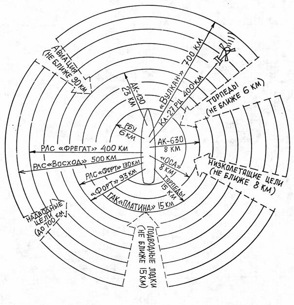 Проект 1164 еще двадцать лет тому назад подошел к реализации этой концепции принятые на нем решения по размещению и составу оружия, в сочетании с высокой мореходностью, маневренностью, скоростью хода позволяют нашему кораблю в определенной степени противостоять действиям любого потенциального противника в удаленных районах океана, без собственного гарантированного воздушного прикрытия. В морских баталиях бывает всякое можно гипотетически представить себе что будет, если наш корабль, даже в одиночку, используя свой мощный ЗРК (с лучшими в мире на сегодня характеристиками) подойдет с целью нападения к авианесущей группе в зону действия своих ПКР или же просто в нелетную погоду: осуществляя полный контроль за палубной авиацией, крейсер, несомненно, разгромит и потопит любое соединение противника. Оценивая же реально нашу эскадру кораблей, прикрываемую крейсером проекта 1164, можно отметить высокую боеспособность (возможность нанести ущерб противнику) и достаточную гарантированную боевую устойчивость (способность предотвращать ущерб). Неофициальная оценка этого крейсера достаточно высока: используя все средства РЭБ и оружие, он может выдержать получасовой бой с любым соединением противника, сбив за это время до 40 45 ракет, идущих на корабль. Повторюсь, что единственной ошибкой при размещении оружия на этом корабле была установка второго ЗРК "Оса" за счет снижения боезапаса "Форта"! В связи с этим представляется тем более нелогичным и неправильным принятое в настоящее время рассредоточение крейсеров этого типа по всем флотам. Насколько бы увеличилась эффективность соединения из нескольких кораблей проекта 1164!