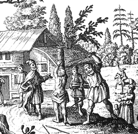 Обратимся к известной «игре в царя» крестьян тверского помещика Н. Б. Пушкина, происходившей в 1666 году. Здесь мы сталкиваемся с одним из проявлений народных масленичных ряжений, и этот смысл «игры» не мог быть непонятен для следствия. Тем не менее вчитаемся и вдумаемся в содержание приговора: самозваные «атаманишко» и «воеводиш-ко» поплатились членовредительством («отсечь у них у правых рук по два перста»), «да их же и которые их водили под руки бить кнутом нещадно и сослать их с женами и с детьми в Сибирь на пашню», носивших фаты и лукошки бить кнутом же, а всех остальных участников процессии «опричь малых ребят, которые в 10 лет и меньше бить батоги нещадно, что в им и иным на них смотря неповадно было впредь так воровать» [83; 62].