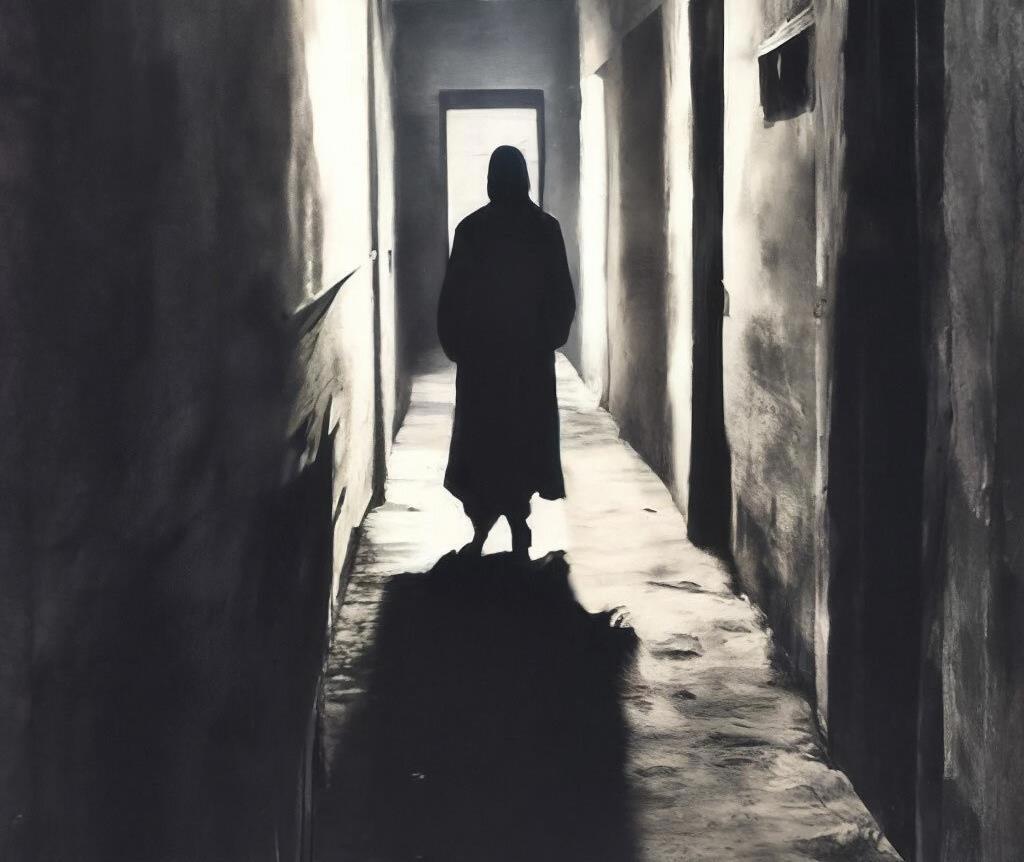 Когда рука провалилась, не находя опоры, слева в конце коридора замаячил блеклый свет из окна. Двинувшись вперёд, я запнулся обо что-то мягкое. Нервы, как натянутые струны, заставили среагировать мгновенно. Развернувшись корпусом в сторону преграды и раскрыв широко глаза, силясь разглядеть возможную угрозу, стал ждать нападения, выставив перед собой нож. Гнетущий момент ожидания растянулся в вечность, вслух максимально обострился и на краткий промежуток времени спёрло дыхание.