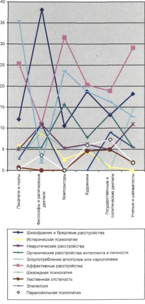 Для того чтобы установить взаимосвязь между психическим здоровьем и гениальными достижениями, современный американский психолог Д. Саймонтон (Калифорнийскийун-т) считает необходимым «проведение большого историко-метрического исследования». Проще говоря, взять любую национальную энциклопедию и посмотреть – кого в ней больше: здоровых или больных? По нашим данным, учитывающим биографические статьи объемом 7000 и более знаков, о лицах, умерших до 1911 г., показатель распространенности психических нарушений по третьему изданию Большой Советской Энциклопедии достигает 86 % (Шувалов. 1992). Разумеется, сразу встают вопросы и достаточно трудные для разрешения: кого считать больным, какими критериями руководствоваться: психотическими, невротическими, психопатическими?