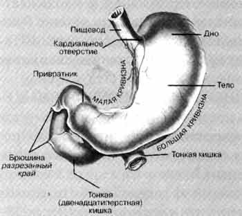 Принято сравнивать желудок с перевернутой ретортой. В нем различают переднюю и заднюю стенки и два края. Вогнутый край, обращенный вправо и вверх, называется малой кривизной желудка. Выпуклый край направлен влево и вниз и носит название большой кривизны желудка. Желудок имеет входное – кардиальное отверстие, выходное отверстие – отверстие привратника и подразделяется на отделы: кардиальную часть (кардиа), дно (свод) желудка, тело желудка и привратниковую (пилорическую) часть. Кардиальное отверстие находится на месте входа в желудок пищевода. Отверстие привратника ведет из желудка в двенадцатиперстную кишку; оно расположено на месте выхода из желудка, названного привратником (пилорус). Кардиальная часть желудка прилежит к кардиальному отверстию. Дно желудка, или свод желудка, следует за кардиальной частью, имеет форму обращенного кверху купола. Тело желудка – самый обширный отдел. Оно расположено между дном и привратниковой частью. Привратниковая часть находится за телом перед выходом из желудка и в свою очередь делится на две части: привратникову пещеру и канал привратника.