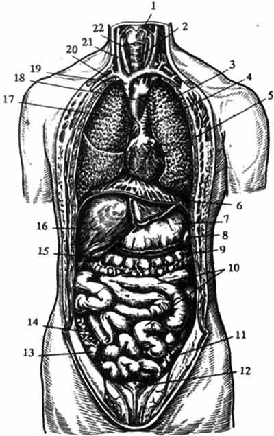 1 – гортань; 2 – трахея; 3 – левое легкое; 4 – легочный ствол; 5 – сердце; 6 – диафрагма; 7 – желудок; 8 – селезенка; 9 – поперечная ободочная кишка; 10 – тонкая кишка; 11 – сигмовидная ободочная кишка; 12 – мочевой пузырь; 13 – слепая кишка; 14 – восходящая ободочная кишка; 15 – желчный пузырь; 16 – печень; 17 – правое легкое; 18 – восходящая аорта; 19 – верхняя полая вена; 20 – подключичная артерия и вена; 21 – внутренняя яремная вена; 22 – общая сонная артерия.