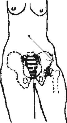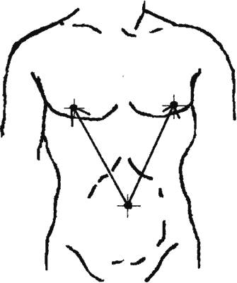 В старые времена диагностировалось это заболевание с помощью лыковой веревки в положении больного на спине с согнутыми коленями. Для мужчин замерялось расстояние между пупом и соском на груди левой и правой половины тела (рис. 26). Для женщин расстоянием между пупом и гребнями подвздошной левой и подвздошной правой кости, в некоторых случаях, расстоянием между пупом и внутренними лодыжками левой и правой ноги, (рис. 27). Если расхождение между замерами достигало 1–3 см, то производились действия, направленные на поднятие желудка.