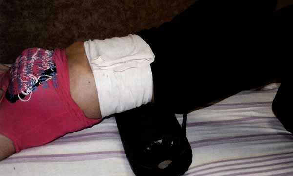 Следующим этапом работы будет обматывание живота простыней, сложенной по длине в несколько слоев. Обмотка делается в положении больного лежа на спине. Низ живота и талия туго обвязываются и стягиваются, простыня закрепляется (Фото 30).