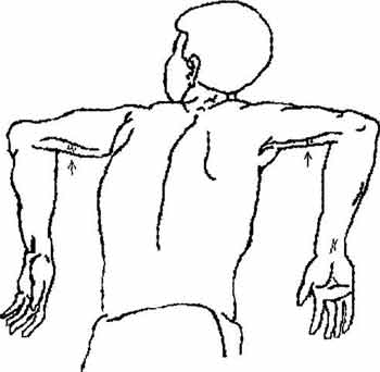 Пациент переворачивается на живот, руки полусогнуты в локтях. Проводится щипок с ущемлением лучевого, локтевого, срединного нервов, проходящих по внутренней поверхности плечевой кости, предварительно определив ближайший поверхностный выход волокон (рис. 31). В момент ущемления происходит дополнительное рефлекторное сокращение желудка и сдвижение его в нужном направлении.