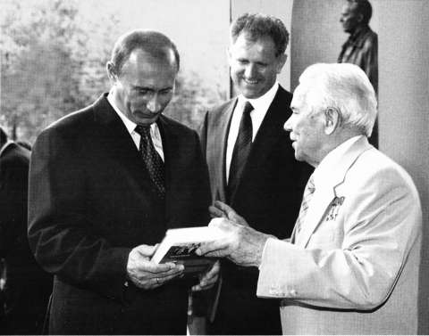 Патриарх Московский и всея Руси Алексий II вручает Калашникову награду Русской православной церкви. Август 2007 г.