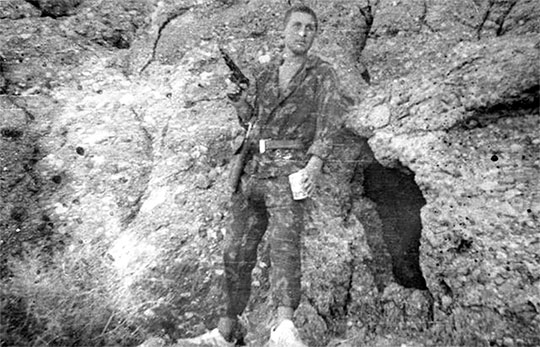 Радиотелеграфист рядовой Комкин у входа в пещеру