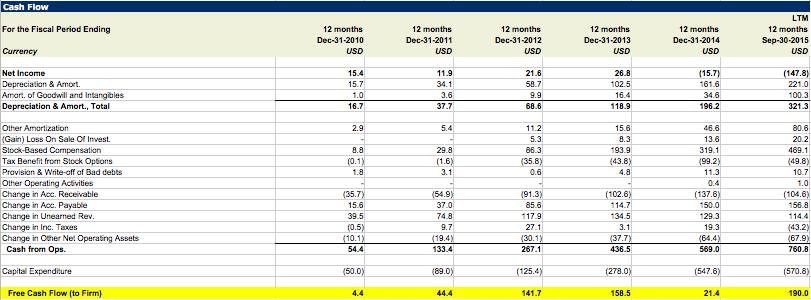 Пример расчета свободного денежного потока (Free Cash Flow) на основе финансовых данных LinkedIn Corp: