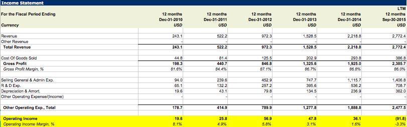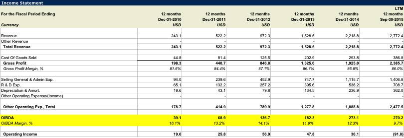 Из таблицы выше мы видим, что LinkedIn Corp имеет второй самый высокий мультипликатор EV/Revenue (отношение стоимости предприятия к выручке) после Facebook, Inc. и самый высокий мультипликатор EV/EBITDA в списке (высокое значение скорее связано с тем, что EBITDA за последние 12 месяцев того финансового года сильно «просела» по отношению к предыдущему, так как мультипликатор EV/Revenue не выходит за рамки разумного). Остается предположить, что высокая оценка компании связана с тем, что она показала стремительный рост выручки за предыдущие несколько лет, и рынок верит, что ей есть куда расти и для этого есть ресурсы. И это предположение имеет рациональный фундамент, так как рост выручки превысил в среднем 31% (CAGR) за 2011 – 2015 гг. При этом за 12 месяцев фискального 2015 года продажи выросли более чем на 37%: