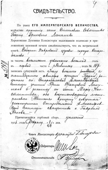Свидетельство о рождении Г.Э. Лангемака. Харьков. 26 февраля 1916 г. ГАОО