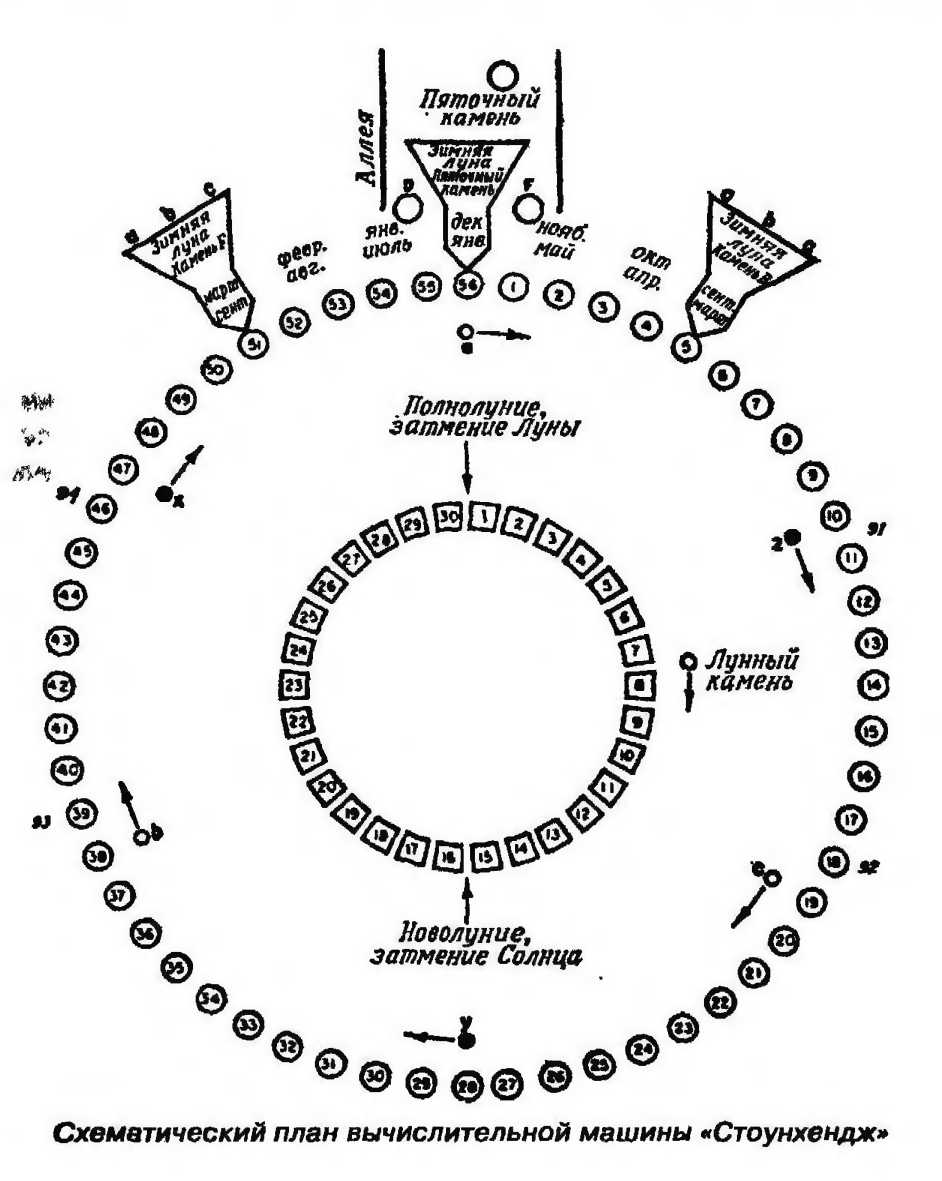 «Не остановившись на достигнутом» и припомнив Диодора, Хокинс открыл в Стоунхендже способ предсказывать затмение1 Пригодился круг из 56 точек – астрономические часы, лунки, по которым двигались упрощенные камни-реперы, пока через 19+19+18 лет действительно не происходило затмение. Причем рассчитать минуту, а возможно, и секунду затмения можно было за несколько дней до него, сопоставляя восход Луны с Солнцем Идеально настроенный опорный прямоугольник точно указывал на Солнце и Луну, в моменты прохождения светилами летних и зимних крайних точек. Таким образом, Стоунхендж, как обсерватория, был еще и инструментом предсказаний. А разгадав назначение лунок (56 и 30), Хокинс открыл, что Стоунхендж был еще и счетно-вычислительной машиной, требовавшей «подстройки» примерно раз в триста лет! Двигая камни-реперы из лунки в лунку каждый день (30 лунок) и каждый год (56 лунок), можно было вычислять фазы луны, полнолуния, 19-летние циклы, лунные и солнечные затмения.