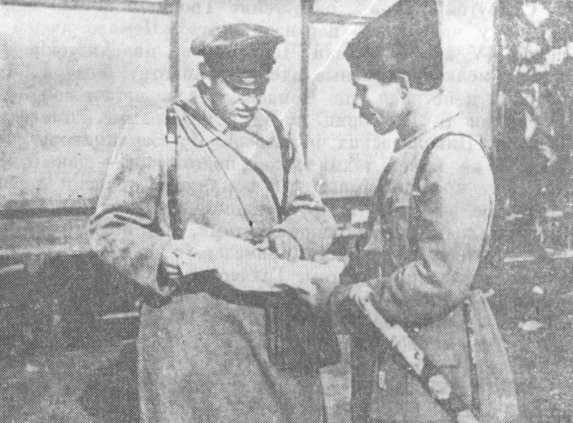 С. П. Захаров (слева) и В. И. Чапаев у поезда на станции г. Николаевска.