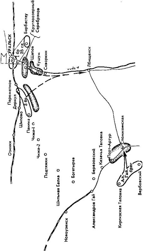 7 февраля М. В. Фрунзе выехал к войскам в Уральск. Штаб Николаевской дивизии и ее 1-я бригада к его приезду находились в Уральске; 2-я бригада располагалась в районе хуторов Серебряков и Круглоозерный со штабом бригады в последнем; 3-я – в хуторах Паника, Широков, Астраханский, Чернухин со штабом на станции Деркул; Александров-Гайская бригада занимала поселки Вербовский и Таловка Киргизская[488]488