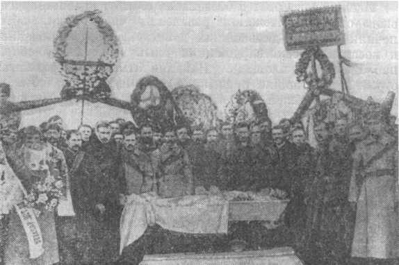 Похороны Г. И. Чапаева – первого военного комиссара г. Балакова, зверски убитого во время белогвардейско-эсеровского восстания 4 марта 1918 г. В первом ряду, в центре – отец погибшего; слева от него – В. И. Чапаев; левее его М. И. Чапаев; далее с перевязанной головой, – председатель союза металлистов г. Балакова поляк В. И. Сечко, раненный во время восстания; крайний справа – С. П. Захаров.