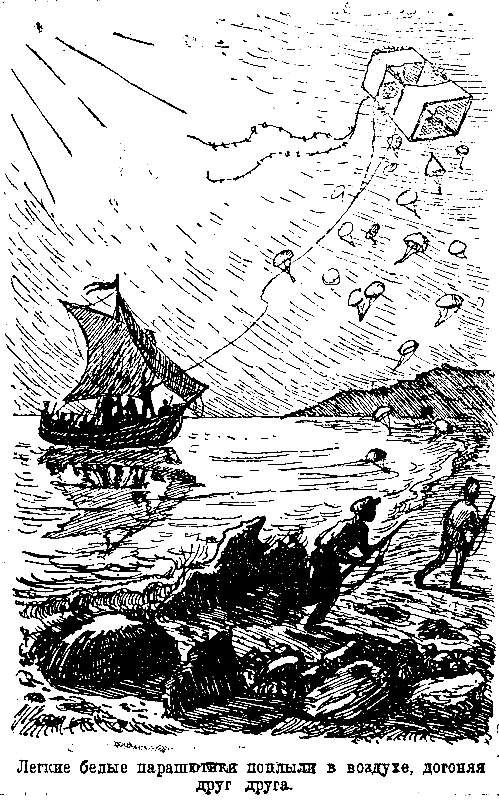 Омелько дергал веревочку раз за разом, и легкие белые парашютики, отрываясь от дирижабля, поплыли в воздухе, догоняя друг друга.