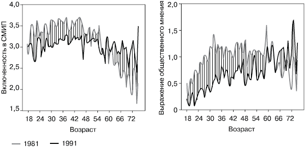 Рис. 3.8. Соотношение активности населения в 1981 и 1991 гг. в сферах приема массовой информации и выражения общественного мнения на возрастной шкале.