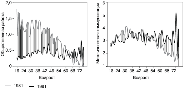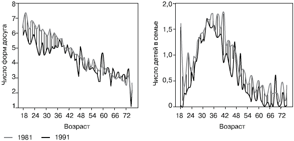 Рис. 3.10. Соотношение активности населения в 1981 и 1991 гг. в сферах досуга и рождаемости (процессе замещения поколений) на возрастной шкале