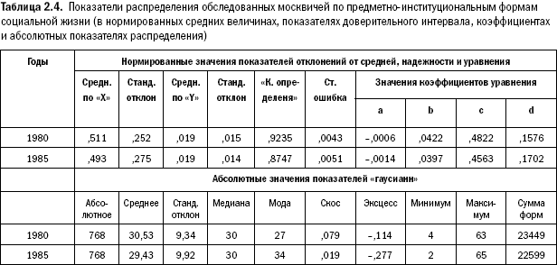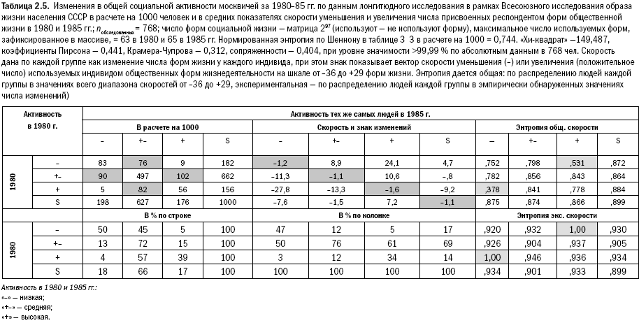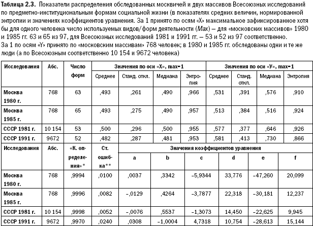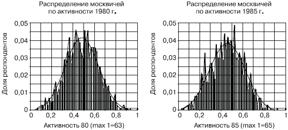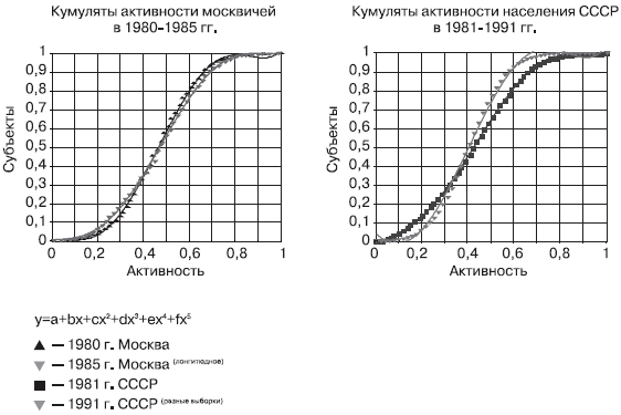 Четким подтверждением существования постоянной общественно необходимого времени на макроуровне предметно-институциональной среды явились результаты лонгитюдного исследования в рамках Всесоюзного исследования образа жизни населения СССР. Включенность в максимальное число форм жизни (дихотомия «используют – не используют») давала матрицу 297, фиксирующую как подсистемные, так и общую активности индивидуумов. Оказалось, что кумуляты активности ансамбля москвичей в 1980 и 1985 гг. практически одинаковы и, кроме того, почти тождественны кривым по двум массивам, репрезентативным населению страны (10 154 и 9672 человека за 81 и 91 гг.).