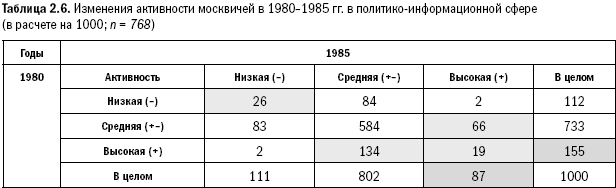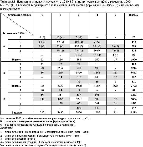 * Например, из 143 человек, имевших в 1980 г. низкую активность (средняя по массиву – 1 стандартное отклонение), 9 перешли к 1985 г. в группу высокой активности (средняя по массиву +1 стандартное отклонение), то есть «прошли путь» на плюс в 2 стандартных отклонения от средней из числа форм общественной жизни, которыми овладели. 69 человек из этого числа сменили активность на среднюю – «прошли путь» на плюс в 1 стандартное отклонение. 57 человек остались в своей группе низкой активности, а 8 из 143 сменили активность на очень низкую – «прошли путь» на минус в 1 стандартное отклонение.