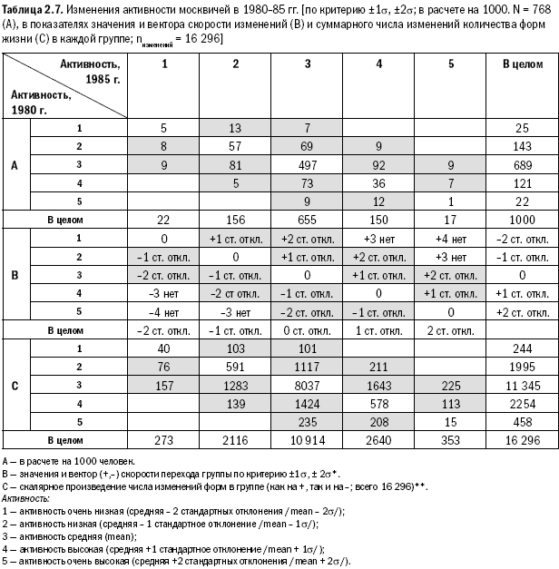 В табл. 2.5 выделены зоны средней по массиву скорости. Люди здесь дают незначительные флуктуации от средней. Остальные клетки таблицы дали оставшиеся шесть групп отличающихся скоростью и ее направленностью: от самой быстрой вниз до самой быстрой вверх. Более подробная шкала активности разбила массив по активности 1980 г. на пять групп по критерию ±1σ, ± 2σ. Тот же критерий дифференцировал и активность 1985 г. Матричная проекция переходов из одного ареала активности в другой стала выглядеть так (табл. 2.7).