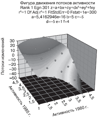 Таким образом, расположив по оси «Х» параметры активности за 1980 г., по оси «Y» – их же у этих же людей за 1985 г., а по оси «Z» – те значения вектора скорости на «+» или «-» от точки баланса на шкале активности, которые получились за пять лет, мы получим искомую фигуру детерминационного поля социальной системы с определенной погрешностью[57]57
