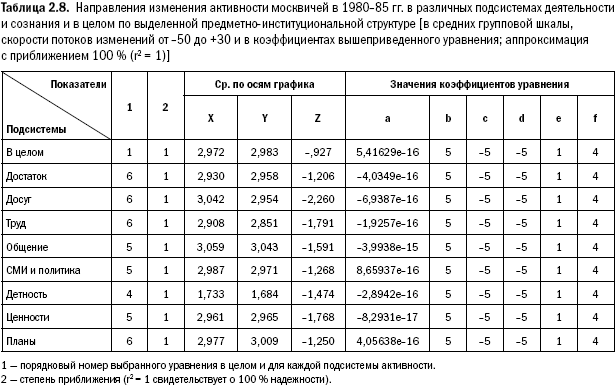 Самые «активные» в 1980 г. группы дают самое высокое падение активности (им есть куда падать), самые «пассивные» в 1980 г. группы дают самый высокий подъем активности (есть куда подниматься). На графике видна искривленность поверхности, по которой происходит движение. В целом поверхность дает чуть больше, чем разделы «А» и «В» табл. 2.6. Ниже приводятся параметры аппроксимации потоков активности в целом, в шести вышеуказанных подсистемах, а также по структуре изменения ценностей и жизненных планов (как вводящие в проблему следующего раздела) по тому же уравнению (z = a + bx + cy + dx2 + еу2 + fxy).