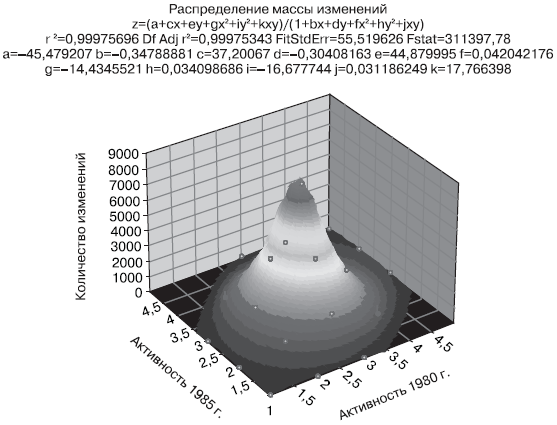 Посмотрим теперь структуру групп по активности с точки зрения общей массы изменений без учета их направленности по уменьшению или увеличению числа форм жизни. Опять помещаем каждого человека в трехмерное пространство: по оси – «Х» его группа активности 1980 г., по оси «Y» – 1985 г., по оси «Z» – суммарные значения числа измененных форм жизни на пересечении этих групп из табл. 2.7С.
