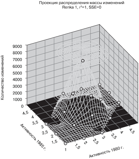 Теперь мы отчетливо видим соотношение «масс» количественных изменений в разных зонах переходов и потоков. На последнем графике четче видны переходы в сетке предметно-институциональной среды. Были «малоактивные», ими же и остались через пять лет 5 человек на 1000 в самом ближнем углу основания графика при суммарной скорости 40 изменений за 5 лет (табл. 2.7А, С). Были «малоактивные» в 1980 г., стали в 1985 г. «середняками» 7 на 1000 в пункте «1» x «3» графика при суммарной скорости 101 изменение (табл. 2.7А, С). Были «середняками» в 1980 г., а в 1985 г. стали «малоактивными» 9 на 1000 в пункте «3» x «1» графика при суммарной скорости 157 изменений (табл. 2.7 А, С). Те, кто остался «высокоактивными», в двух замерах находятся в самом дальнем углу графика. Основное число количественных изменений при средних скоростях переходов – в середине «конуса» поверхности. Проекция на плоскость над фигурой дает своего рода «галактический» диск. При некоторых производных по этому же алгоритму интерполяции рядом с основным «диском» появляются две «спутниковые» проекции разобранных выше «выбросов» наиболее активных количественных переходов на уменьшение и увеличение. Если бы мы перевернули фигуру сетки, то аналогия с «полем тяготения» временной константы, держащей основную массу актов движения вокруг центра и позволяющим лишь узконаправленные выбросы в полярные области, была бы очевидна.