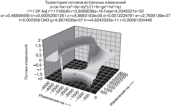 В принципе эту дилемму можно обойти с помощью имплицирования категории «время» в переменные по осям трехмерного графика. Если по оси «X» отложить суммарные значения увеличения числа форм жизни за 5 лет (скалярное произведение изменений на плюс в каждой из клеток, т. е. общую массу увеличения, распределенную во времени), по оси «Y» – суммарные значения уменьшения числа форм жизни (скалярное произведение изменений на минус в каждой из клеток, т. е. общую массу уменьшения, распределенную во времени), а по оси «Z» – число людей, имеющих эти массы и прошкалированных значениями скоростей переходов («-2», «-1», «0», «+1», «+2»), то потоки изменений от оси баланса «тяготения» примут ту форму, в которой они протекали в различных направлениях за пять лет.