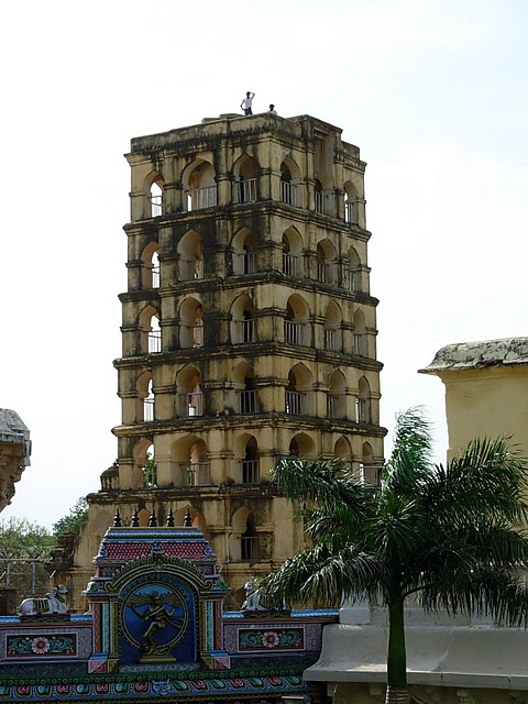 Главным аттракционом королевского дворца, являлась колокольня, она же дозорная башня. Это было здание, с девятью этажами галерей. Снаружи колокольня выглядела весьма заурядно, и обыденно, но внутри представляла собой, невероятно запутанный лабиринт лестниц, переходов, балкончиков и проходов, порой удивительно узких и низких и совершенно темных. Во дворцовом комплексе посмотрели Дурбар – зал верховного суда, мемориальный музей Раджи Сирфоджи, От входа во дворе прошли в восточном направлении на улицу Восточного Вала. Как следует из названия, когда-то здесь проходила городская стена, от которой сохранился один из бастионов, а на его площадке оказалась установлена гигантская кованая железная пушка «Раджгопал», созданная в правление короля Рагунатха Наяк.
